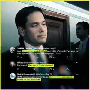 “While regular Floridians are worrying about keeping themselves and their families safe from the pandemic, Marco Rubio is yet again more concerned with his political ambitions. Floridians deserve a leader who will stand by them during a crisis, but sadly spineless Marco Rubio is more focused on impressing Iowa politicians than protecting his own constituents,” said Florida Democratic Party spokesperson Grant Fox.