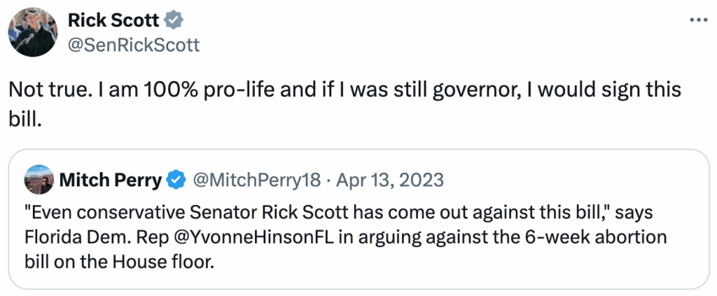 Following the Florida Supreme Court’s ruling that triggered the six-week ban, Scott has run from his past support for the cruel and unpopular law, which rips away access to reproductive health care before most women know they’re pregnant. But Scott said it himself: “I am 100% pro-life and if I was still governor, I would sign this bill.”