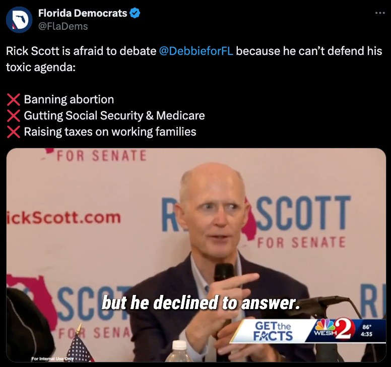 For months, Rick Scott has refused to accept any of the three televised debates invitations agreed to by his Democratic opponent, Debbie Mucarsel-Powell. Why? Because Scott can’t defend his toxic agenda: banning abortion, ending Social Security and Medicare as we know them, and raising taxes on the middle class.